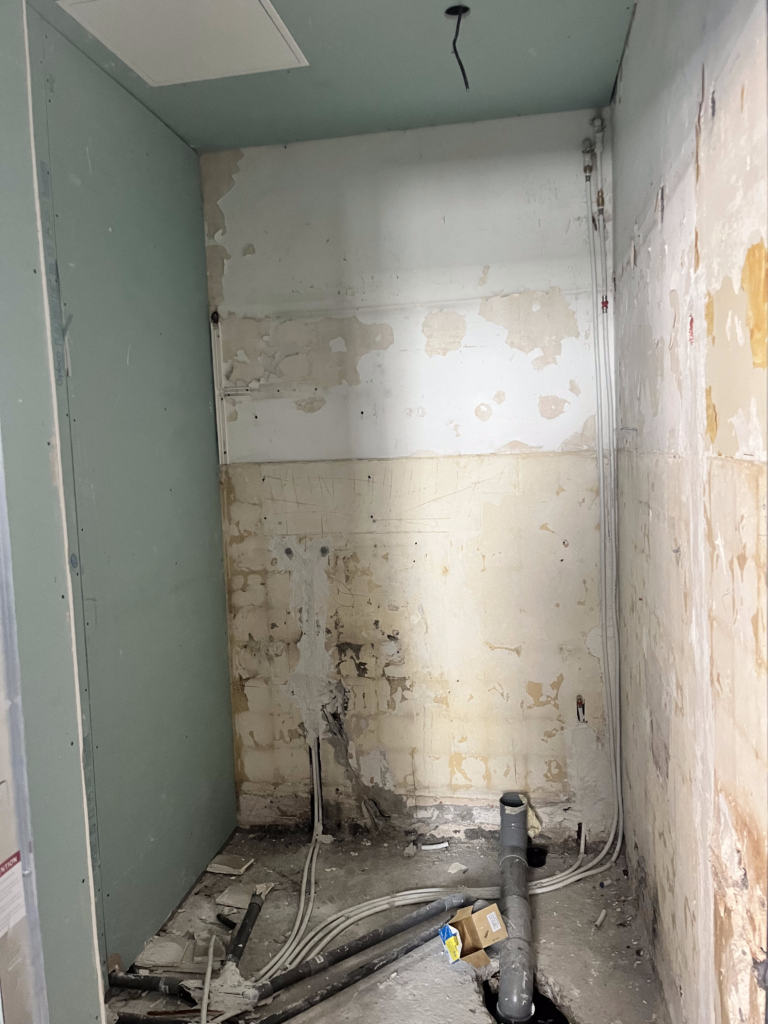Après les différentes déposes, nous avons commencé à travailler la chape pour la pose du futur carrelage (choisit par le client). Nous avons par la suite posé de nouvelles cloisons de séparation des espaces en gardant la cuisine ouverte. Un travail de fond a été réalisé au niveau des murs avec une préparation des supports avant la mise en peinture. L’électricité tout comme la plomberie ont été complètement rénovées.