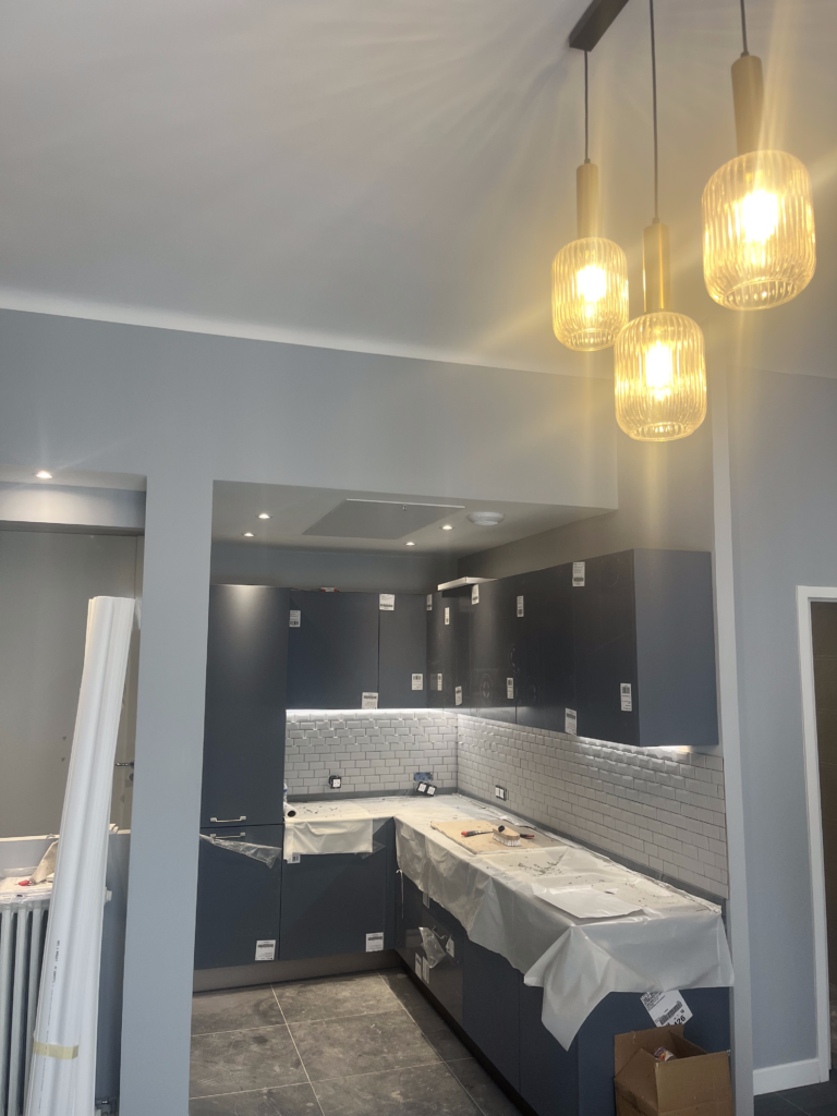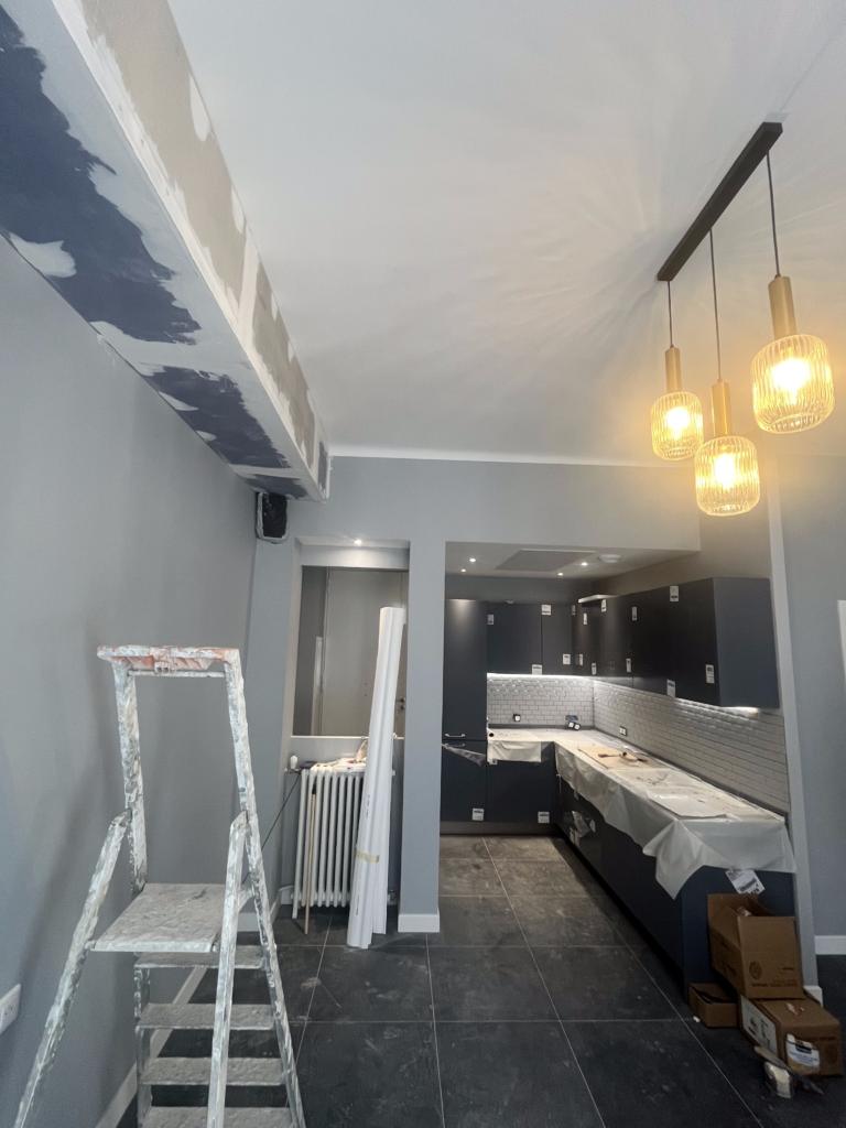 Un système d’éclairage LED, avec des spots encastrés et des luminaires design, a été installé pour créer une ambiance chaleureuse et accueillante.